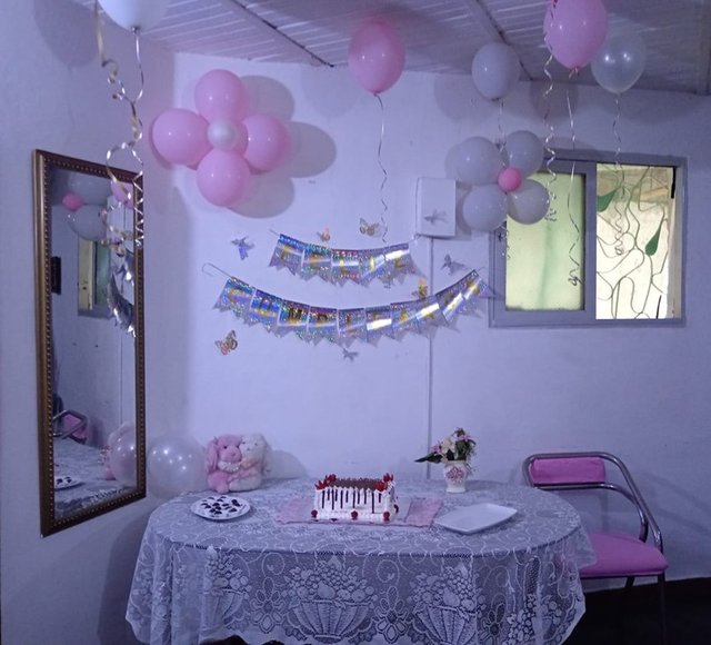 La decoración se le hizo en una esquina de la sala de estar en su casa, aprovechando el color de las paredes y el color de los muebles, se compraron varios globos de color rosado y blanco, yo solo ayudé a inflar los globos porque en realidad no se armar esas florecitas, mis amigas hicieron la decoración y les quedó muy hermosa, las letras plateadas colocadas en frente de la torta atrapaban las miradas, los globos colgando del techo les dio más vida al lugar, tanto la torta como la decoración fueron una dulzura.