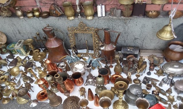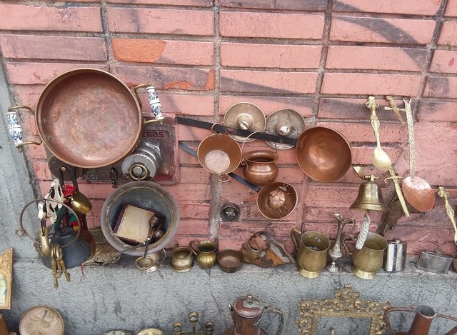 Me llamó mucho la atención lo que un señor y su esposa exhibían, vendían todas clases de utensilios para la cocina como ollas, sartenes, tazas, campanas, cucharones y planchas de hierro para calentar con el calor del fuego, pesos de la época, candelabros, adornos de animales, cubetas de bronce y otros artículos del hogar, como candelabros, planchas, jarras, portarretratos, espadas, pipa, llaveros y un sinfín de antigüedades de hierro, latón, metal y bronce.