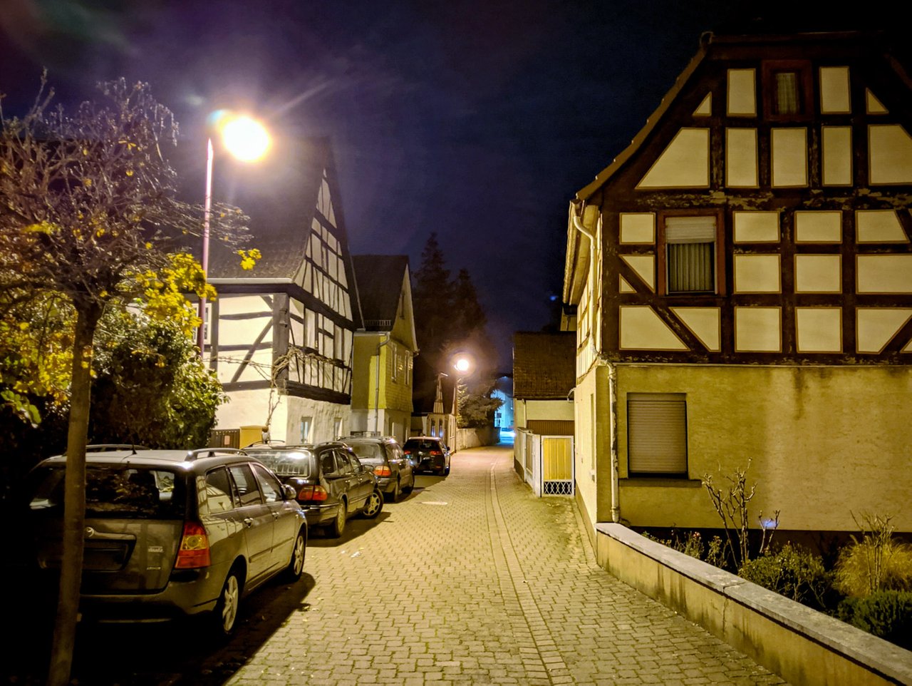 I took a walk through the village to chase some pokemon after dark. Just behind that old chapel I already showed to you a two weeks ago, there's a small road with a bunch of old timber framed houses. I would say it's probably the prettiest street this little town has to offer.
