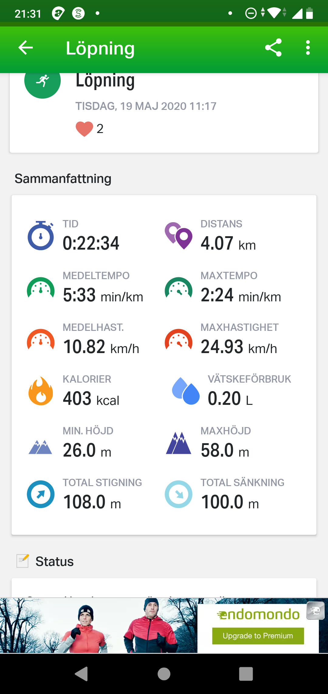 Felt a bit sore since I tried to break pb on 10k yesterday, so did a shorter session today. But did 8 laps hill intervals so was really exhausted afterwards.