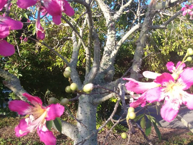 In South Florida this is how we do the fall color change on the trees we have pink blossoms bloom on some kind of an orchid tree with extreme thorns on the trunk zoom in and take a look at those storms they are killers