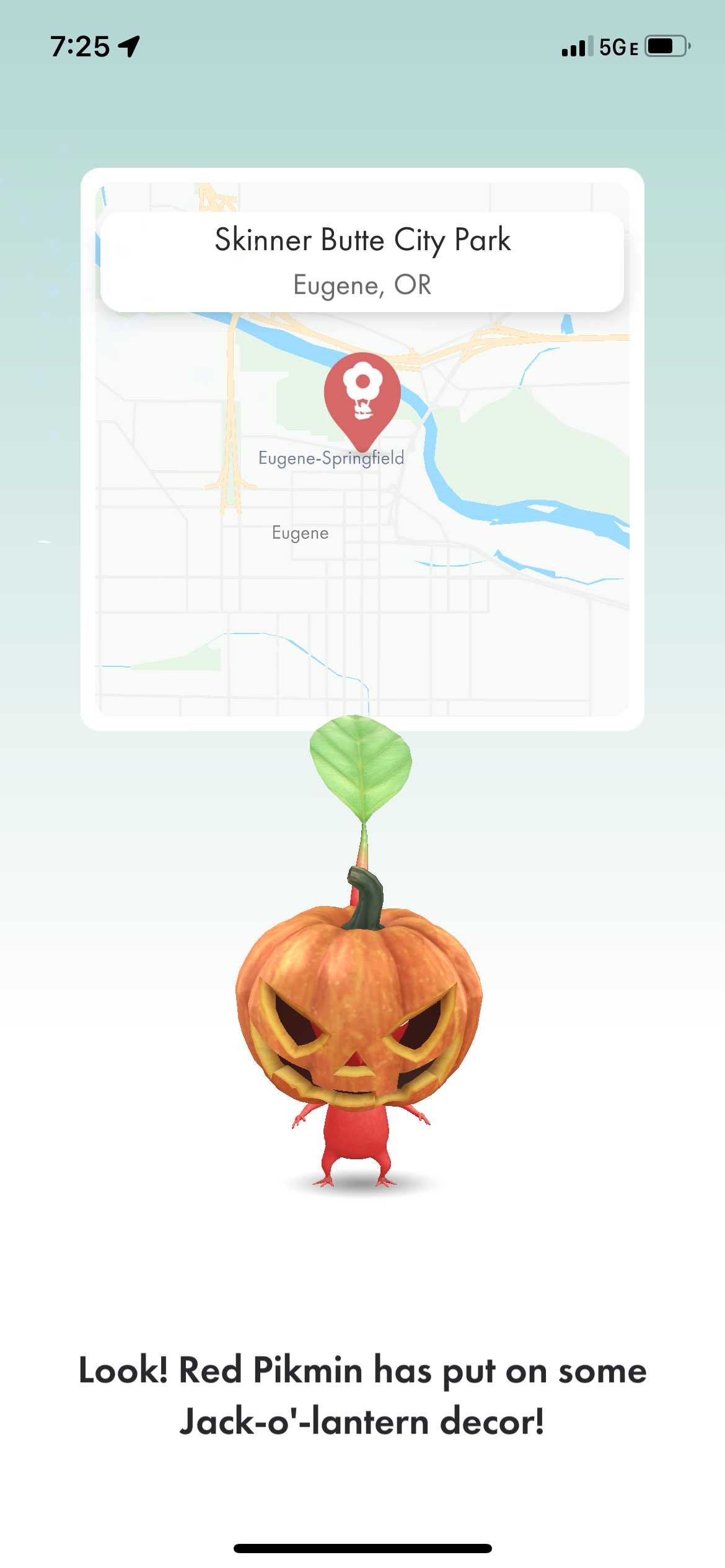 I took my morning walk along the riverbank path to Alton Baker Park, adding in a side trip into downtown Eugene to do a Pikmin Bloom scan near the train station. The second phase of the Halloween event has started in Pikmin Bloom, so a different set of holiday-themed pikmin can be acquired in the game.