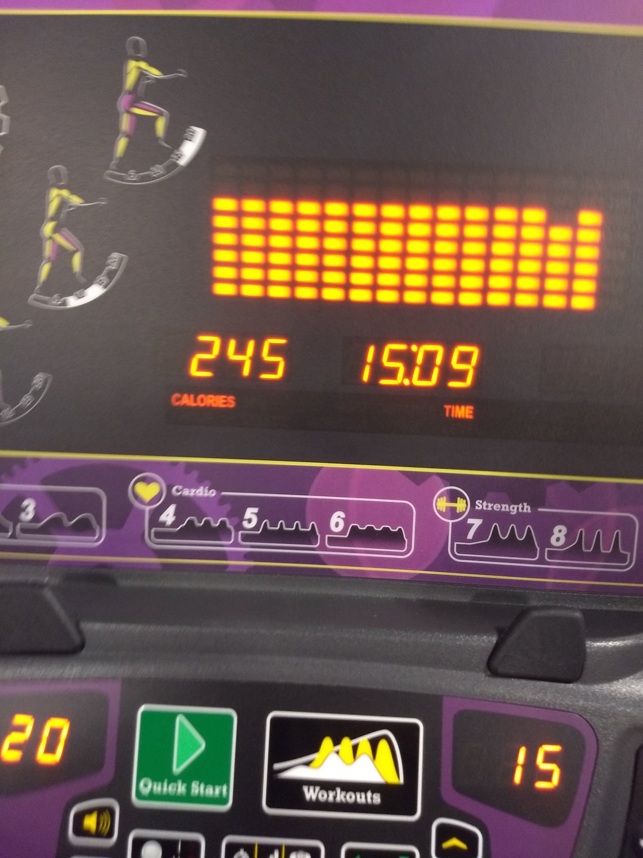 After work I headed over to the gym for a quick workout. Fifteenth minutes on the elliptical, a mile in on the treadmill in just under 16 minutes and 20 minutes on weights.