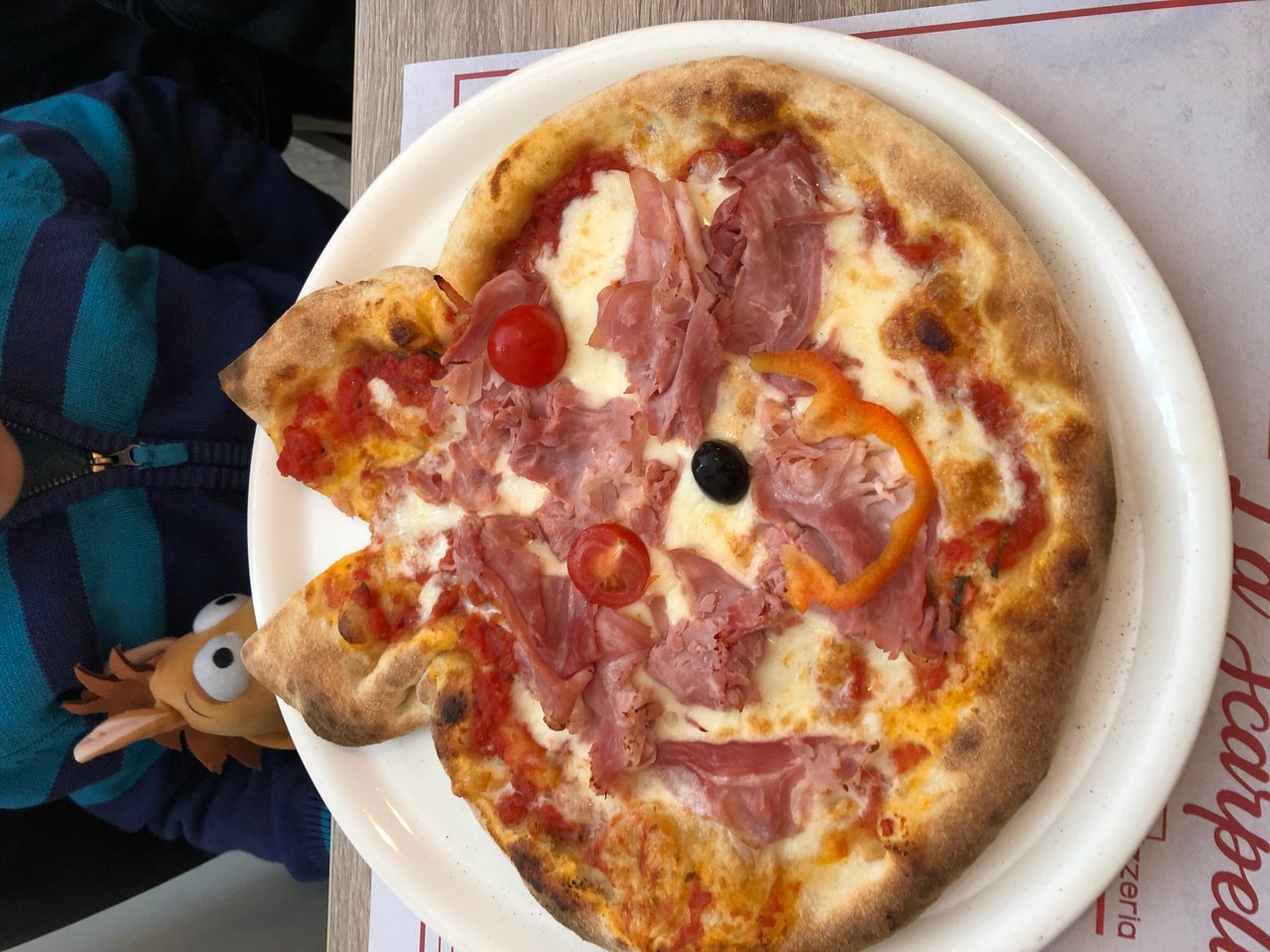 Nous nous sommes vengés sur une magnifique pizza. Le pizzaiolo a même eu une petite attention pour notre petit garçon.