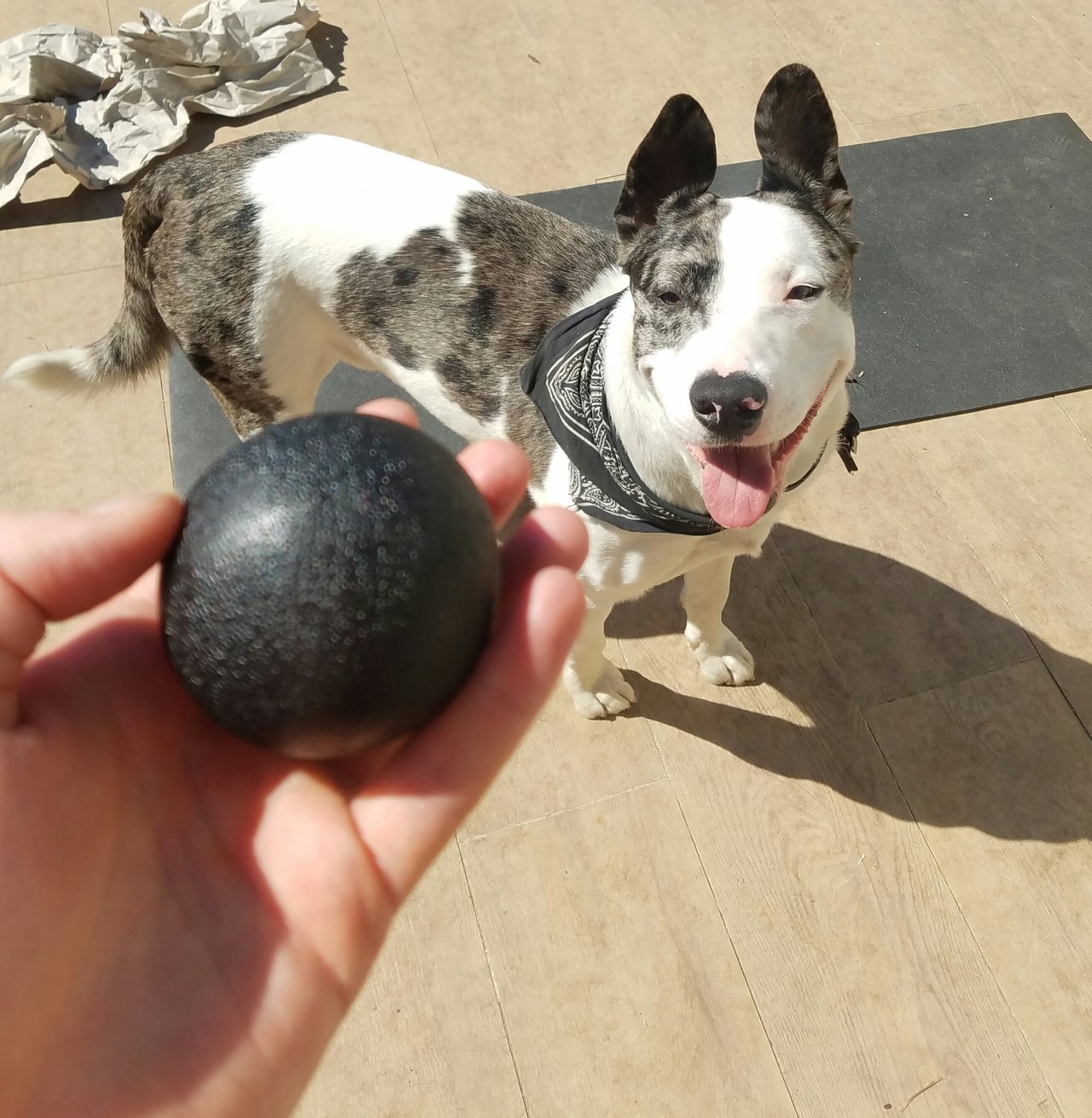 What a wonderful sunny day. Today, I haven't done any physical exhausting activities. I just stretched and did some self massage. On the photo on top, we can see my massage ball and the dog thinking it's its toy...