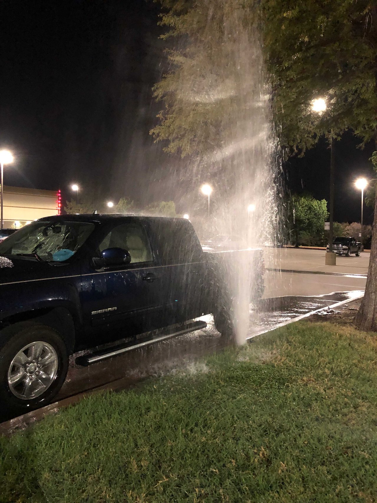 When my husband and I came out of a movie tonight, we found a sprinkler gushing and looking like a fountain beside a truck in the parking lot.