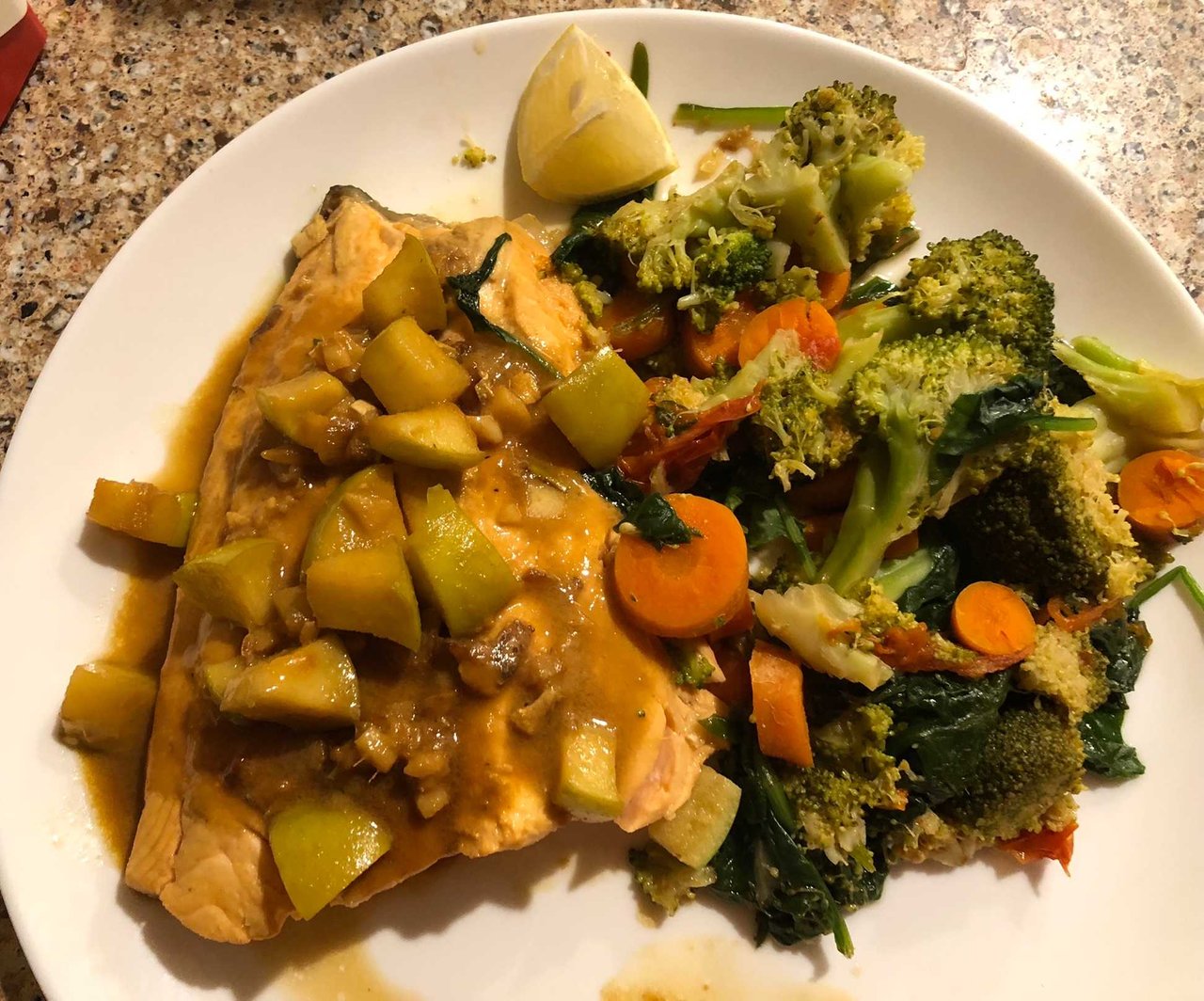He cooked salmon with green apples on top and veggies another night.