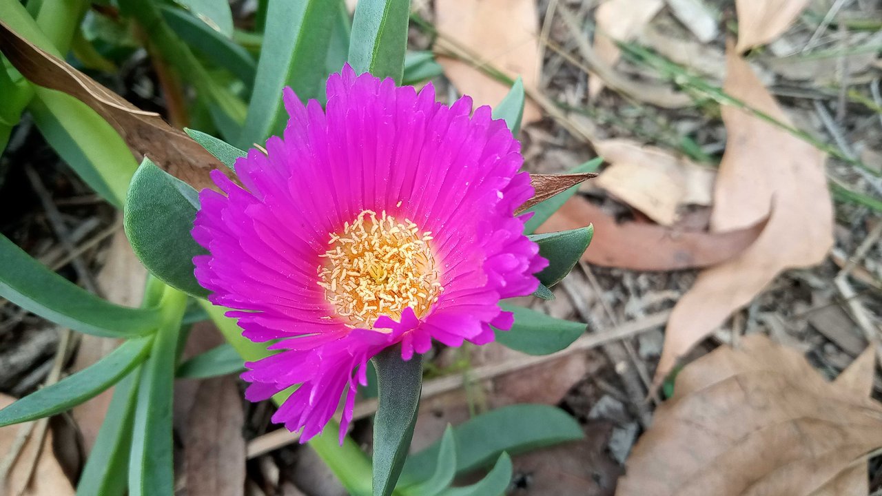 I was checking on the pig face plant I started growing from a cutting a few months ago and it has now started flowering it's bright pink flowers hence the plants common name pig face.