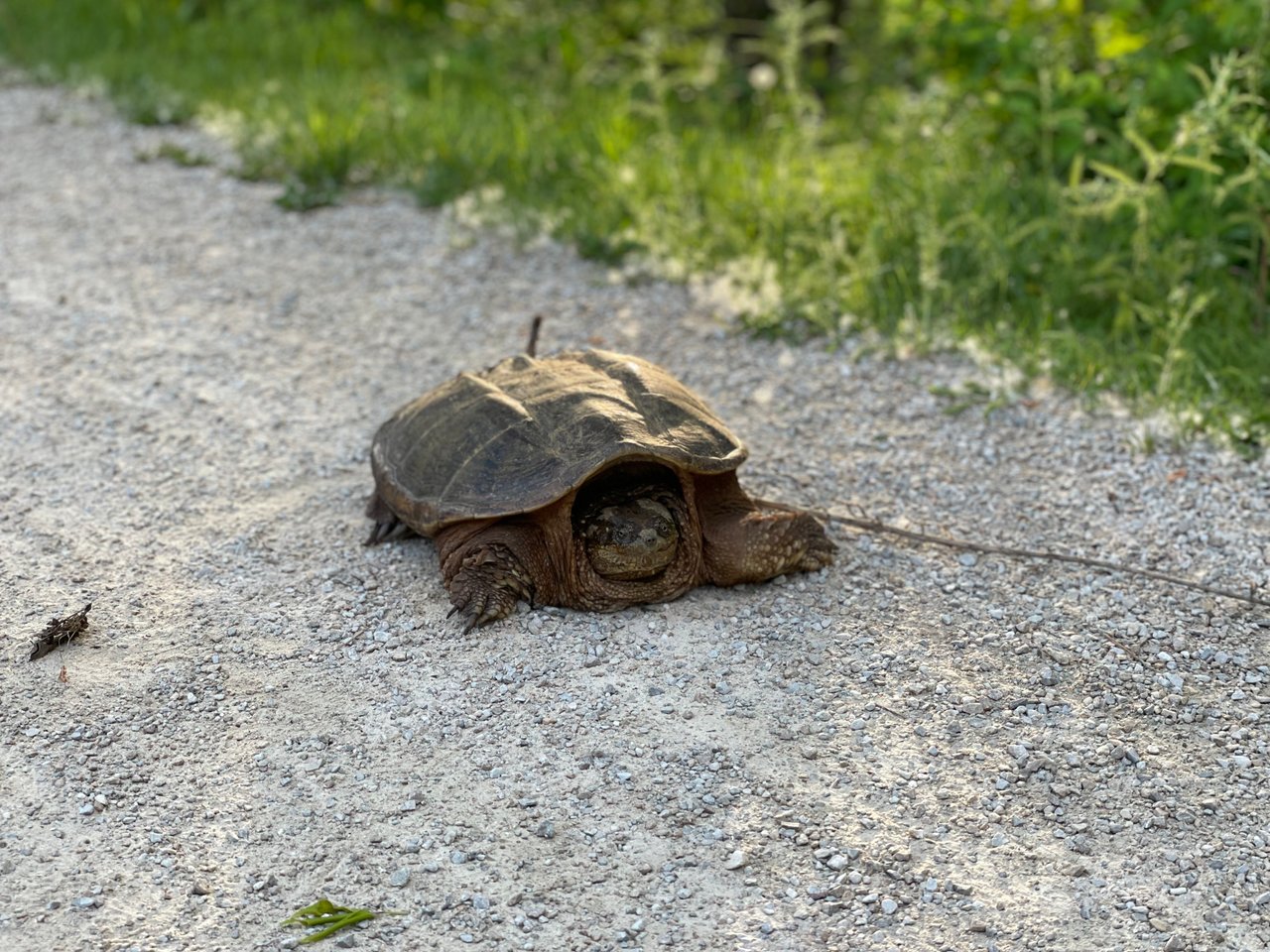We met someone unexpected on the trail — a great big snapping turtle! Several people were gathered and were watching it. One man conjectured that it was a female getting ready to lay eggs.