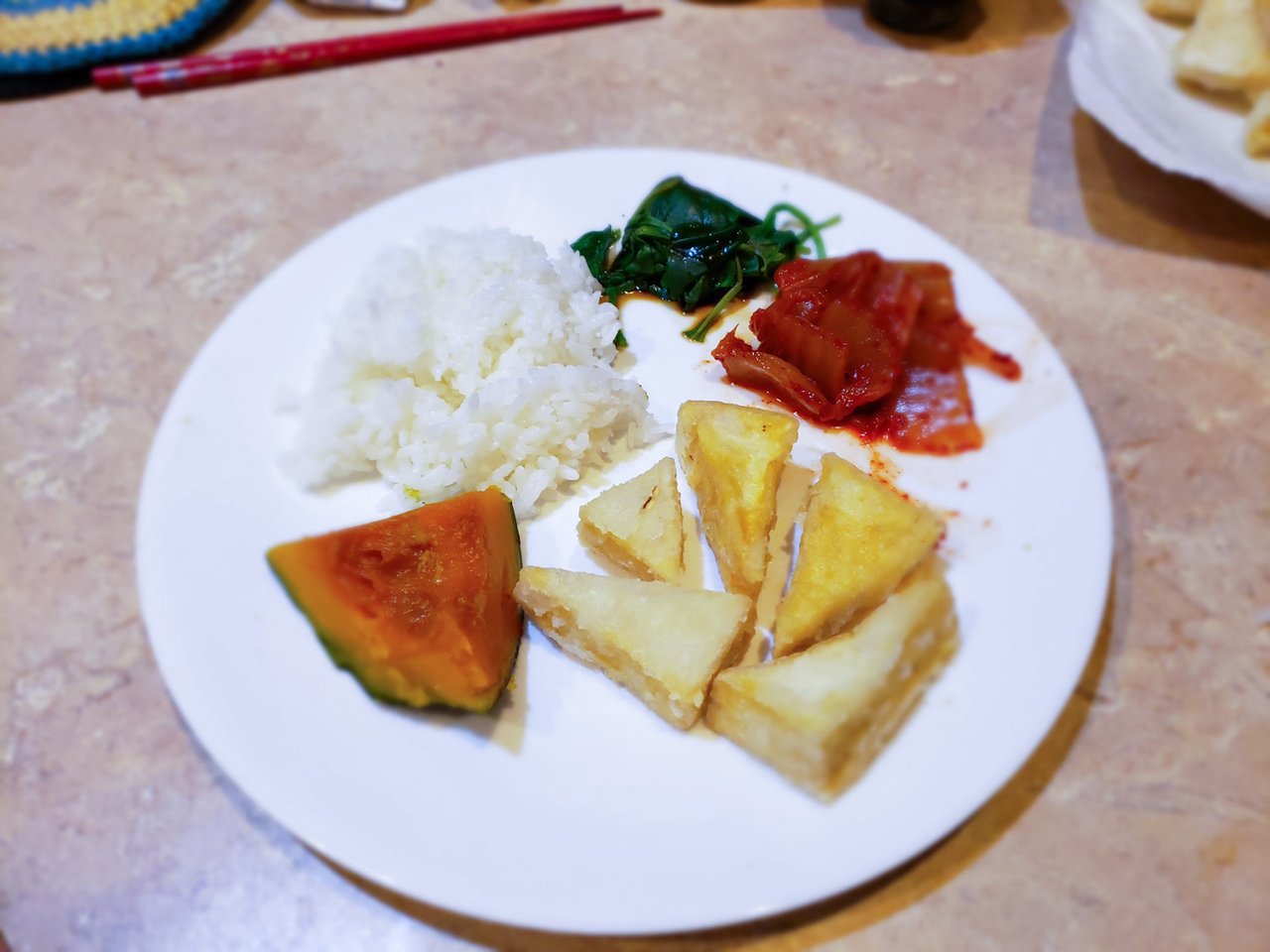 Rice, deep fried tofu, pickled cabbage, squash and some other condiments. Yum.