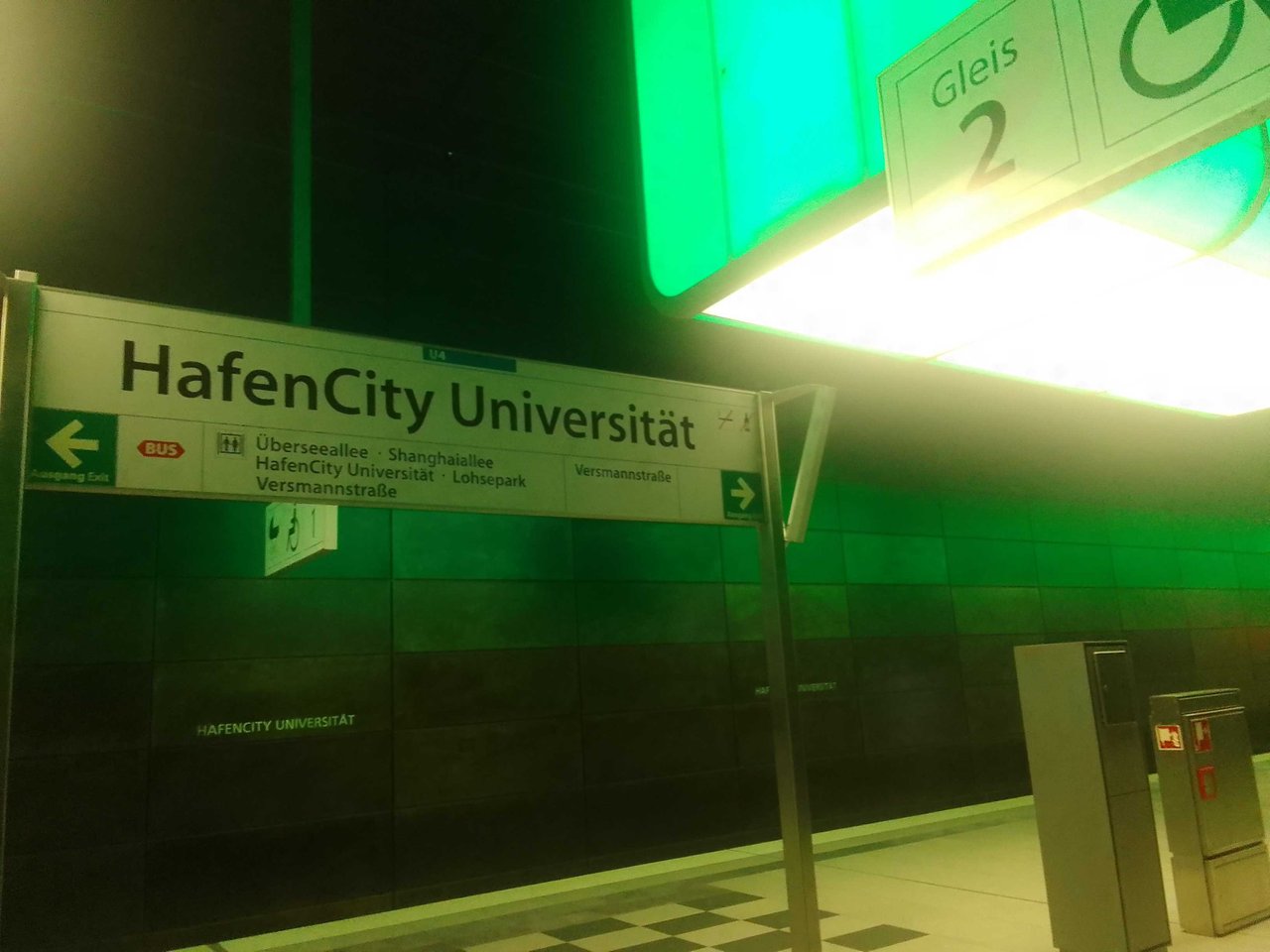 We then set off. Via Hauptbahnhof and continue with the U4 in the direction of Elbbrücken. We then passed the new stop "Hafen City University". Very interesting design. The colors change every 15 minutes.