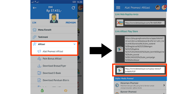 Cara membagikan link afiliasi sangat mudah. Buka aplikasi BebasBayar - Afiliasi - Alat Promosi Afiliasi - Copy Link Afiliasi Play Store seperti pada gambar dibawah ini :