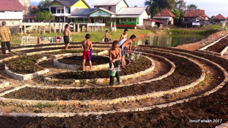 Kebun di sekolah ini harus menyenangkan. Supaya para santri senang. Karena itu kebun dirancang serupa taman. Langkah pertama dengan meminjam desain mandala, atau kebun melingkar, yang telah dipopulerkan para penggiat permakultur.