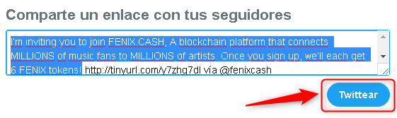 Tuitea el mensaje preestablecido clickando en 'SHARE ON TWITTER'. después ingresas la URL del Tweet en la casilla señalada, clickas en 'CHECK MY TWITTER SUSCRIPTION' para validar tu tarea