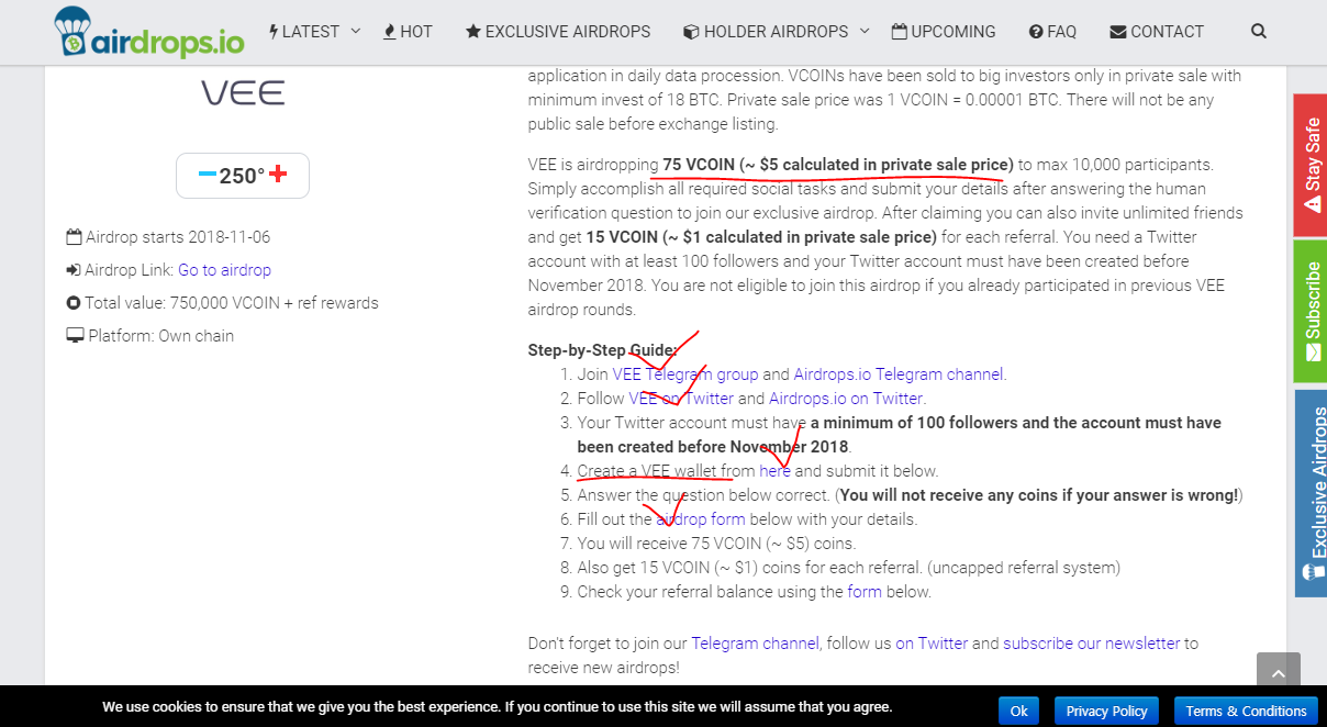 - 에어드랍페이지에 이메일, 텔레그램ID(@포함), 트위터ID(@포함), VEE 주소를 적습니다.