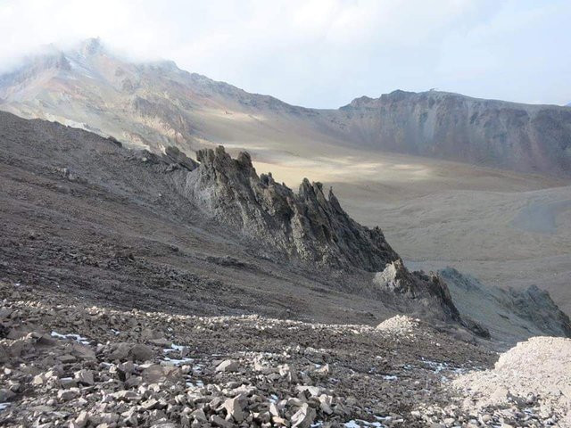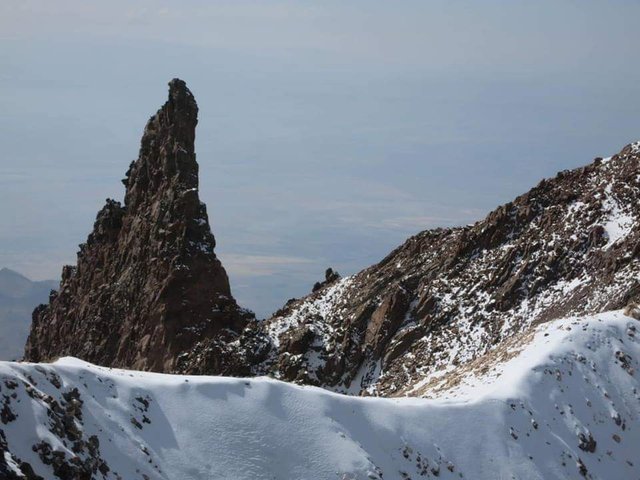 Словно дракон со скалистым хребтом. Небольшой, метров 300. И каменный пик. Острый как акулий зуб.