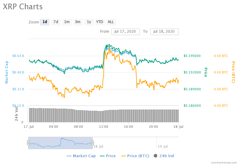 The third-largest cryptocurrency by market cap was no exception to how the price action played out. The day started with a sharp price drop, which brought the price below $0.19. However, XRP quickly recovered and got on a slow upward trend, which may be stopped by the moving averages above it. If, however, XRP manages to pass them, the $0.2 resistance level will still pose a big problem.