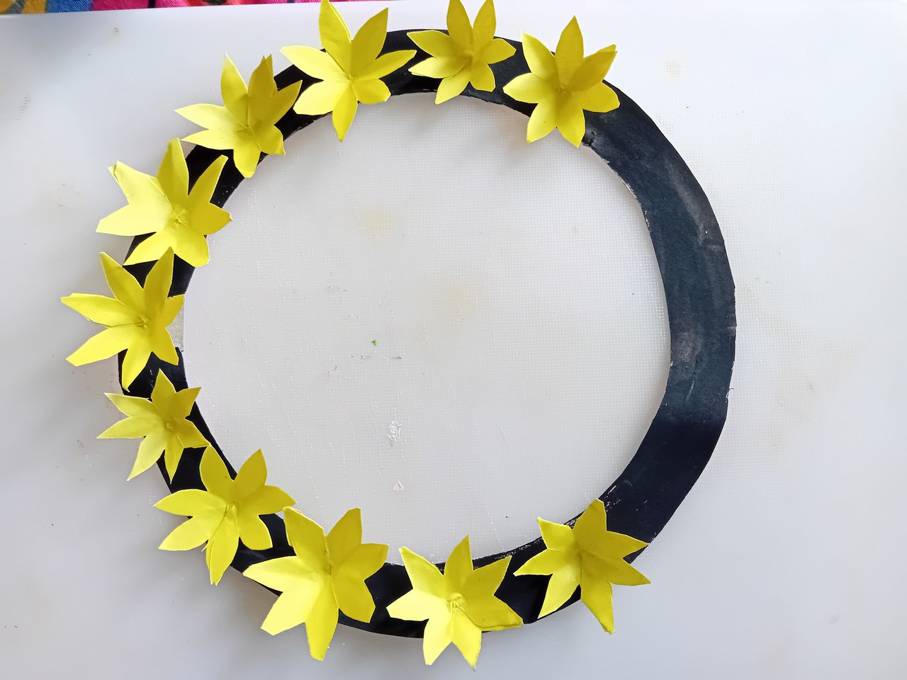 একটা কার্ডবোর্ড থেকে কিছুটা অংশ নিচে দেখানো ছবির মত করে গোল করে কেটে নিলাম। তারপর সেখানে ফুলগুলো লাগিয়ে দিলাম।