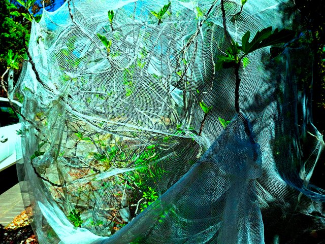 The fig tree in front of our house is soon gonna be different. It will bear fruit, as the leaves are already visible. It does every year fruit, and soon, juicy figs will appear on the branches. But I have permanently placed this white net on the tree.