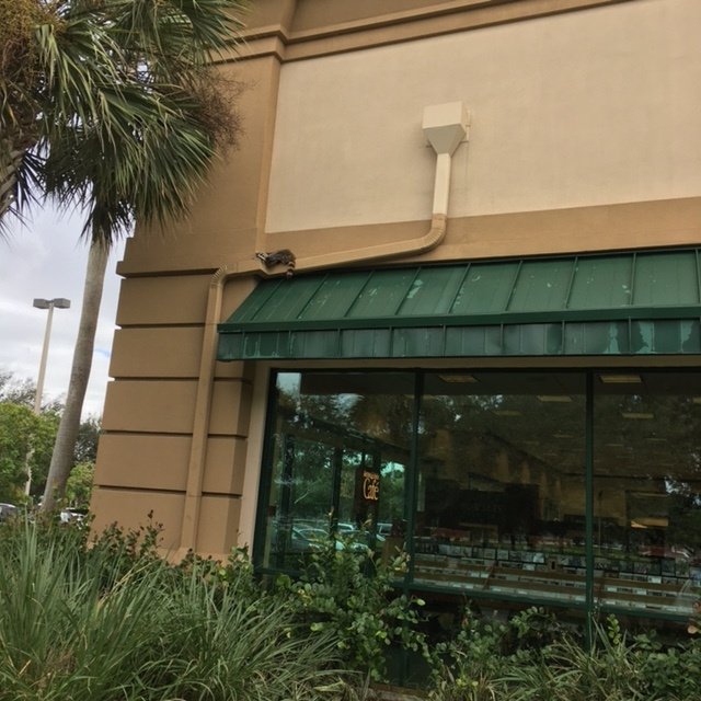 As I was entering a Barnes and Nobles store, a fuzzy ringed tail and dark object on the gutter caught my eye. I hope you enjoy these photos as much as I enjoyed watching this guy.