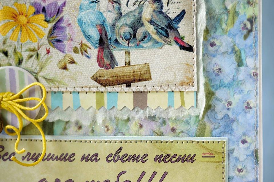 На лицевой стороне использована распечатанная на холсте картинка с птичками, цветами и маркой, под ней скрапбумага и кусочек белой бумаги из-под китайского чая. Также использована пуговица из чипборда, вощёный шнур и металлическая подвеска-нота.