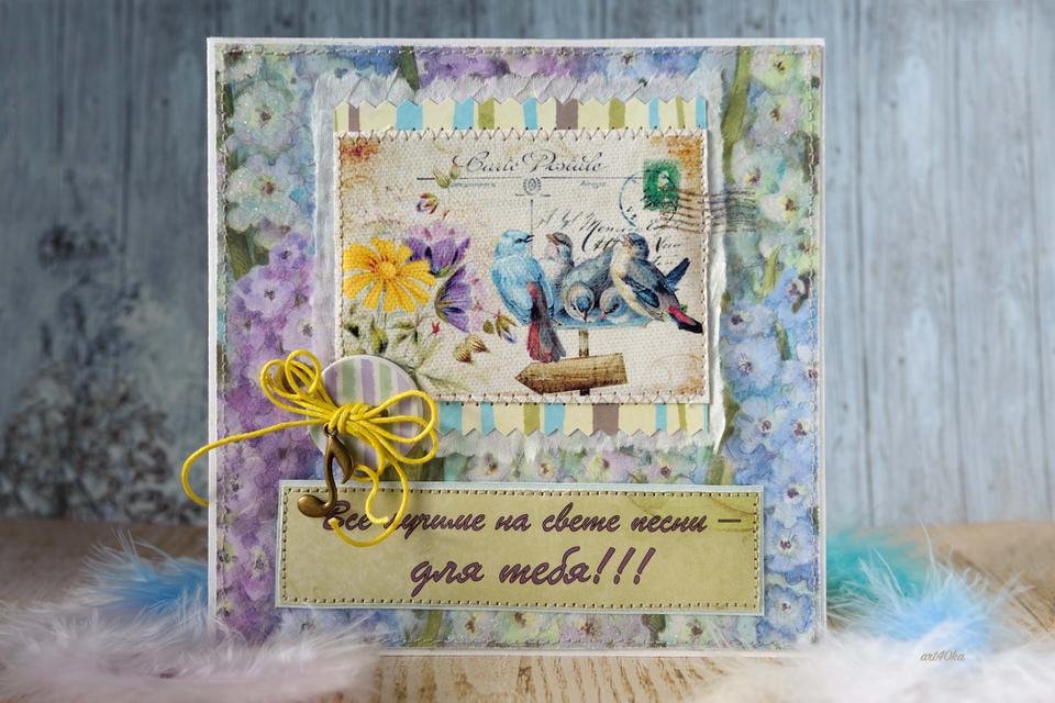 I wanted to do without standard inscriptions, such as "Congratulations" or "Happy Birthday". The main actors on this postcard are birds, hence "All the best songs in the world are for you !!!" And on the back: "From the bottom of my heart a big song».