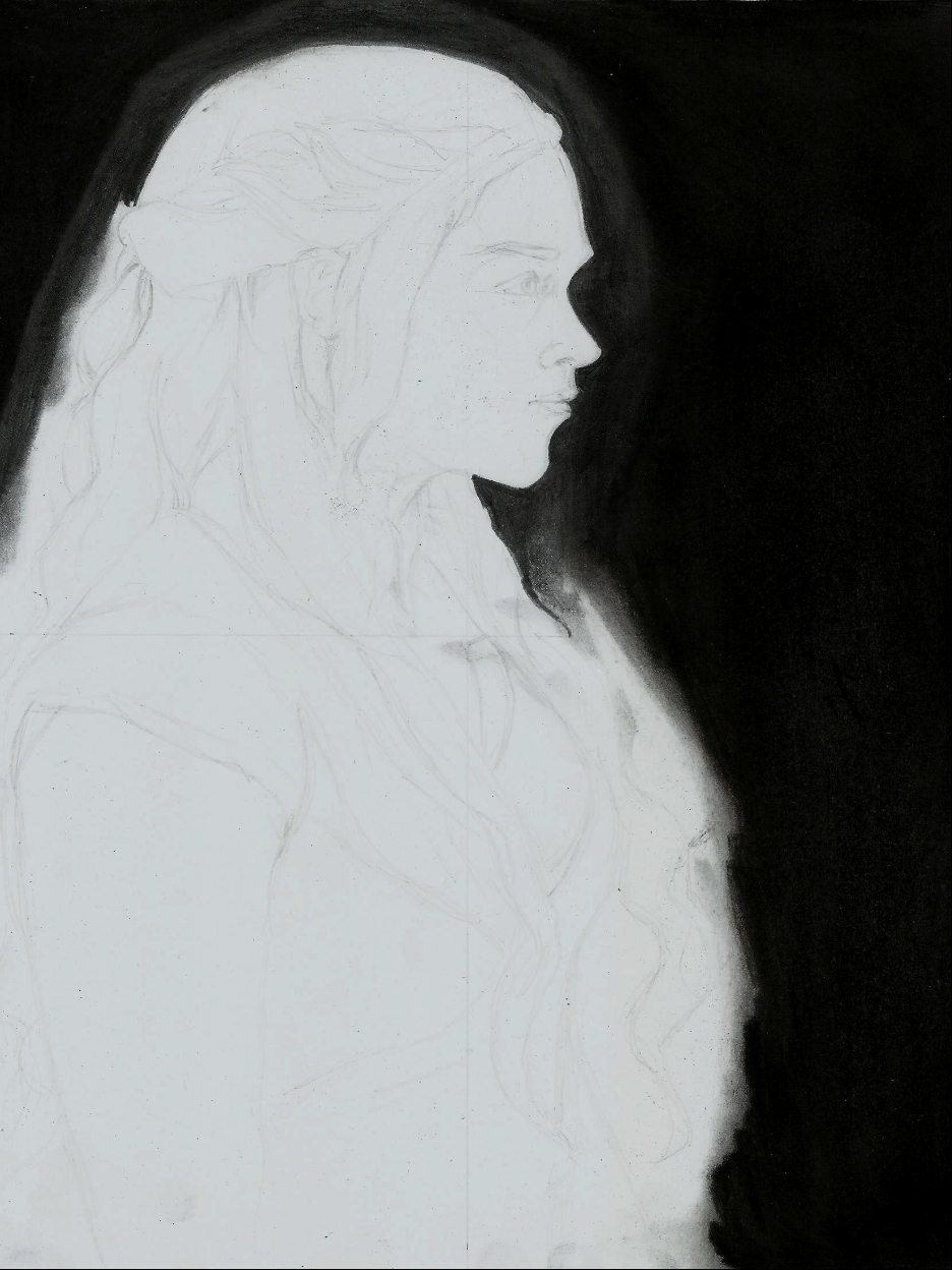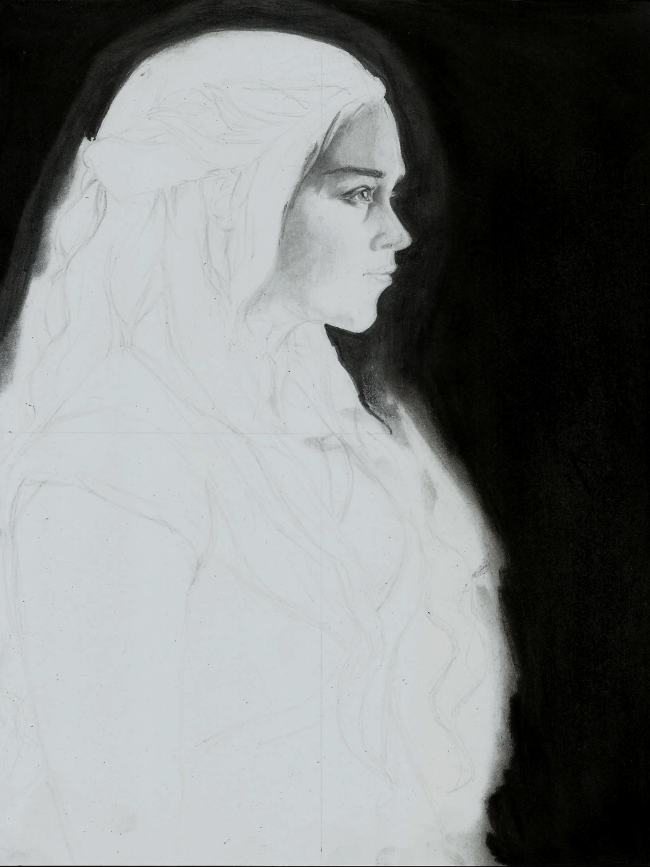 Debido a la blancura del cabello de Daenerys fue necesario oscurecer el fondo, esto lo hice con el lápiz de carboncillo, otorgándome una ventaja y una desventaja, ya que este es más oscuro que el grafito pude obtener un negro más intenso, pero debido a esa intensidad es muy difícil de borrar.