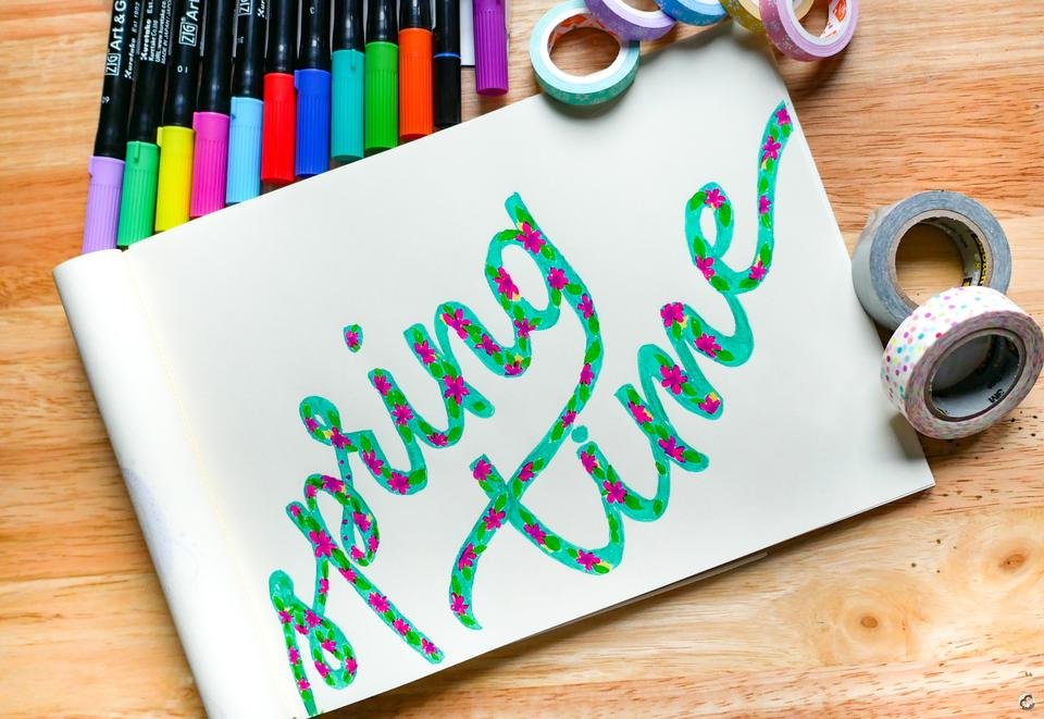 My favorite of this entry because it includes flowers and leaves! I used pink, lemon yellow and three shades of green for this. And because I didn't really plan this ahead, I miscalculated the space, so I ended up writing time below spring. But I think it was not too bad, what do you think?