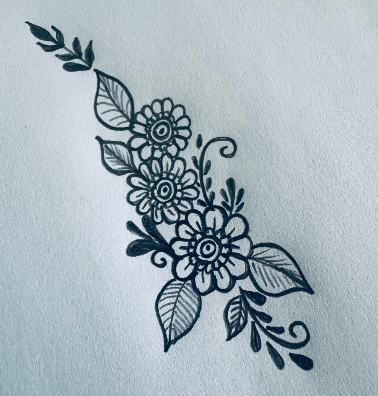 এরপর ফুলটির উপরে আরো দুটি ফুল, পাতা সহ আরও একটু ডিজাইন করে আমার অংকন শেষ করেছি।