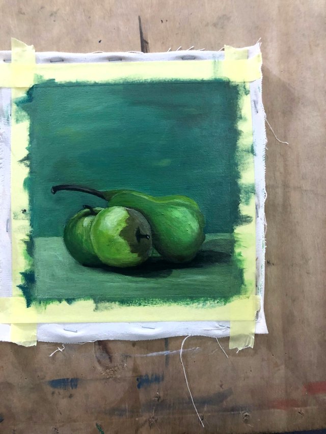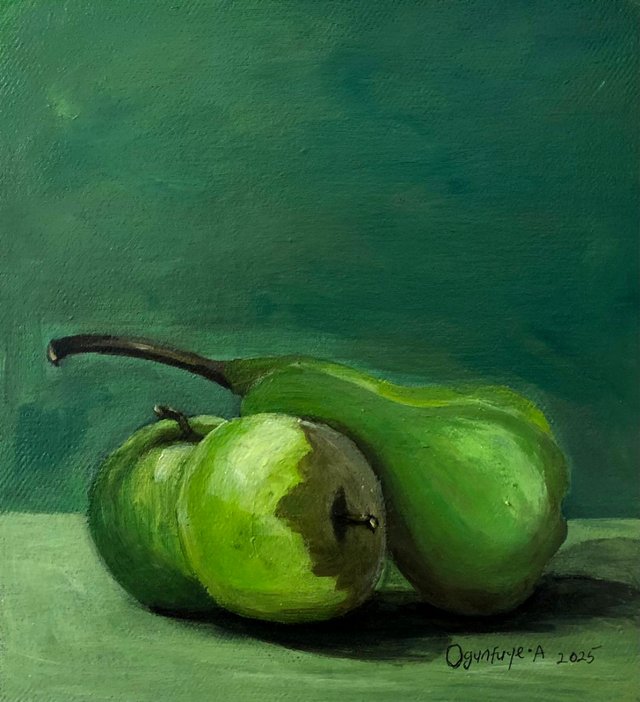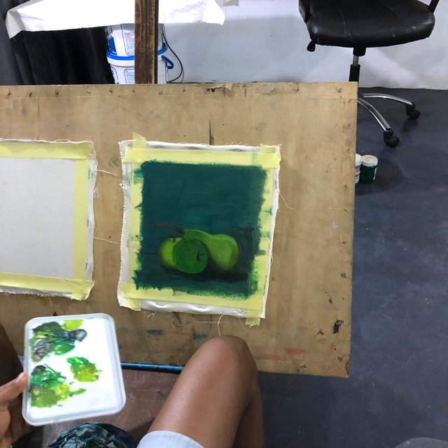 Hi guys, today I bring to you another still life drawing, this time around I was told to do a live study of fruits in different shades, different value, and different tones, first, I learnt some painting technique from @tezzmax by watching him paint, then I was told to apply the same technique in my painting and also asking him questions, the techniques I learnt are: To paint my background one color before sketching the fruits and the table base, to start with the darkest value to the lightest, which I found difficult to handle while painting mine, how to mix my colors, how to apply my grades of colors, and painting the shadow before applying the middle tone to the lightest tone whch I also find difficult to do because I prefer applying the shadow almost at the end of my painting, and how to give painting life, by amonising the totality of the painting using one or more dominanting colors of my pallette.
