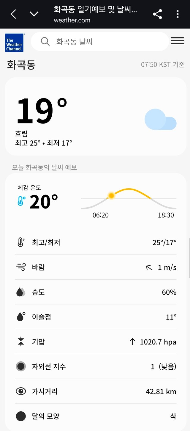 오늘 아침 우리동네 기온이 19도로 시작해 체감은 20도로 걷기에 딱 좋은 날씨였어요. 바람은 1m/s로 살짝 불어주고 습도는 60%라 답답하지 않은 상쾌한 공기가 폐 속까지 스며듭니다.