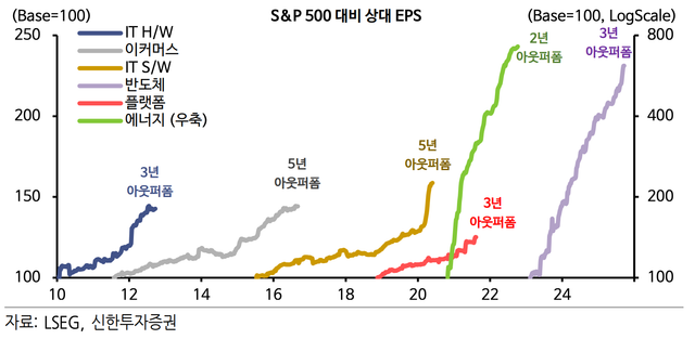 과거 데이터를 보면 섹터별로 실적 주도주로 올라서면 3~5년간 지속적인 아웃퍼폼하는 경향이 있다고 볼 수 있겠습니다.