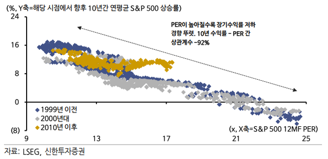 다만 5~10년짜리 중기 흐름에서는 평균회귀 전략이 의미가 있다 하겠습니다.(PER가 지속적으로 높은 상태를 유지하기 힘듦)