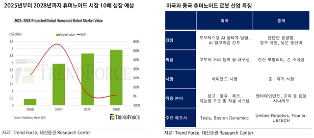 범용 로봇과 휴머노이드 로봇이 미중 기술 경쟁의 중심축으로 부상하며, 시장도 확대 예상. Trend Force는 2025년 5억달러 미만 시장이 2028년 40억 달러까지 커질 것으로 추정
