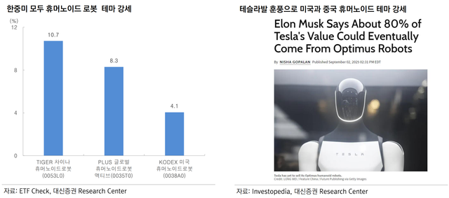 최근 일주일 동안 중국 휴머노이드 로봇 테마(0053L0) +10.7%, 한국을 포함한 글로벌 휴머노이드 테마(0035T0) +8.3%, 미국 휴머노이드 테마(0038A0) +4.1% 상승
