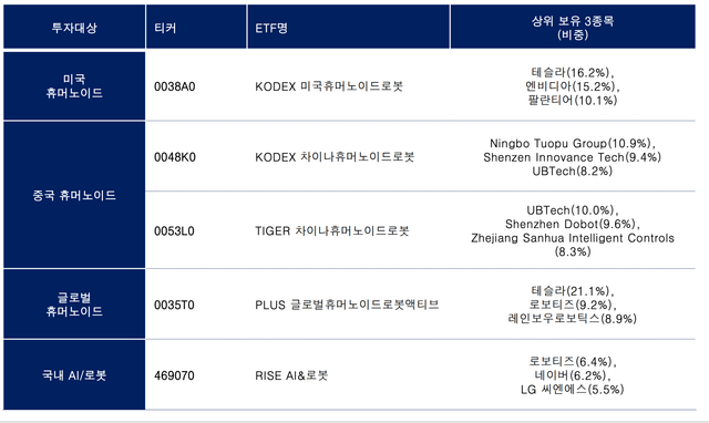 - 관련 ETF: KODEX 미국휴머노이드로봇(0038A0), TIGER 차이나휴머노이드로봇(0053L0), PLUS 글로벌휴머노이드로봇액티브(0035T0)