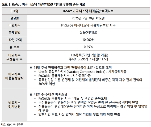 미국의 대표 주가지수 중 하나인 나스닥 종합지수의 종목들과 한국 금융채들을 함께 편입하는 액티브 운용 방식의 ETF