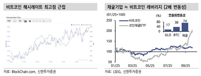 금광채굴기업이 금의 레버리지 속성이 있는 것과 마찬가지로 코인채굴기업도 비트코인의 레버리지 성격이다. 연율화변동성 기준으로도 비트코인은 최근 40%를 기록한 반면 채굴기업ETF는 80%에 육박해 두 배