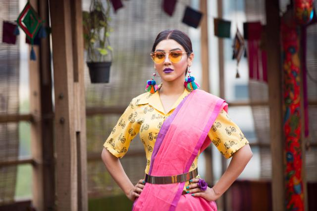 Lipstick, sunglasses, pendants and rings are different when it is a different look. Sarees: Deshalal, Blouse: Dreidle, Encana: Sikoso, Venue: Passage Break