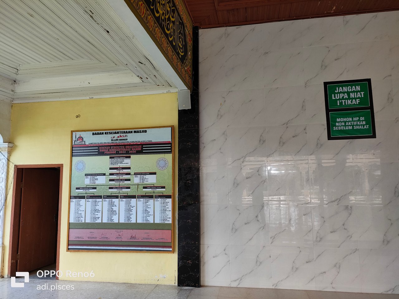 Di dinding sebelah kanan dan kiri masjid terdapat beberapa papan informasi mengenai masjid ini, seperti keadaan KAS masjid atau Laporan keuangan masjid , jadwal kegiatan sholat Jum'at dan struktur pengurus dan pembinaan kesejahteraan masjid, semuanya terpampang di dinding untuk memberikan informasi kepada masyarakat dan pengunjung masjid