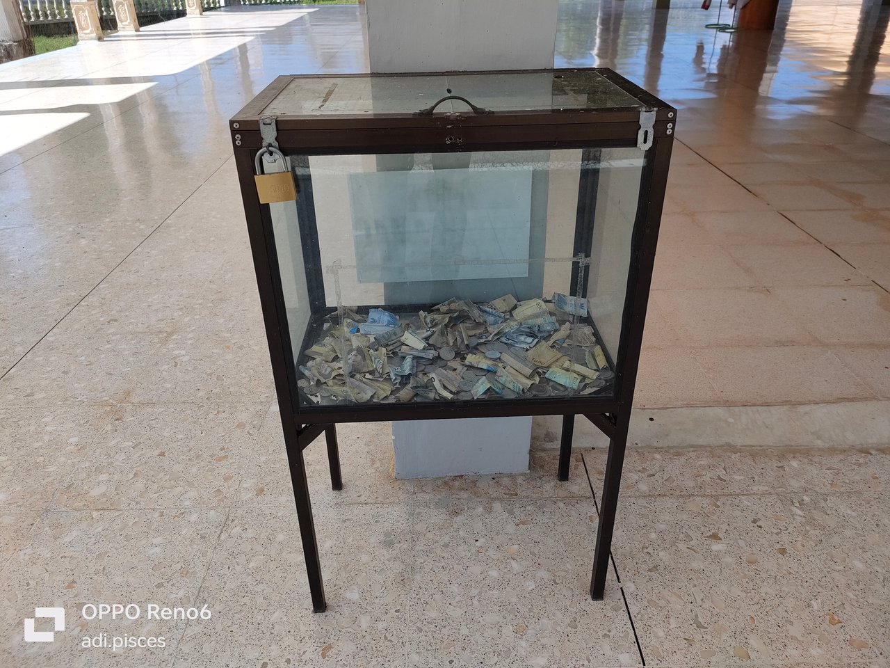 Di tiang tengah mesjid terdapat satu gantungan mukena dan sajadah untuk kaum perempuan, hanya saya setelah selesai di pakai tidak di lipat dengan rapi, maka terlihat amburadul dan menggangu penampilan dalam ruangan masjid ini, mudahan untuk kedepannya setelah dipakai dapat dilipat dengan rapi , dan juga terdapat satu kotak amal masjid, dana dari kotak amal ini dipergunakan untuk kepentingan masjid ini