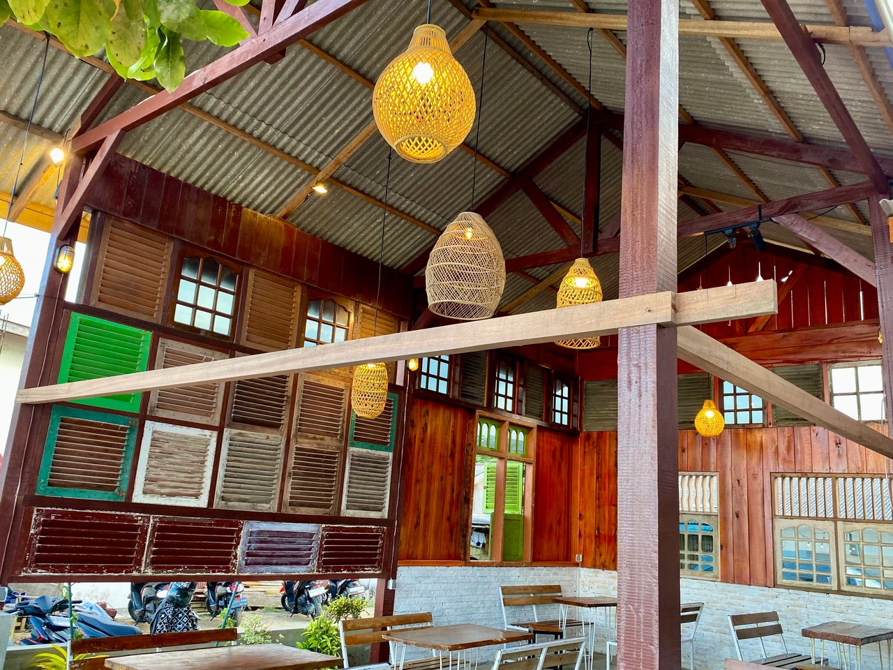Kafe ini tidak langsung terlihat dari jalan utama. Kita harus masuk melalui gang kecil, kemudian belok ke kanan, dan baru terlihat bangunannya yang penuh lampu-lampu cantik dan estetik . Kami memilih duduk di lantai atas yang terbuka, tepat di sudut. Dari sana, pandangannya bagus banget ke arah laut Lhokseumawe, ideal untuk foto-foto. Oh ya, kafe ini juga punya banyak spot duduk lain yang estetis, jadi kalau kalian suka foto, pasti betah.