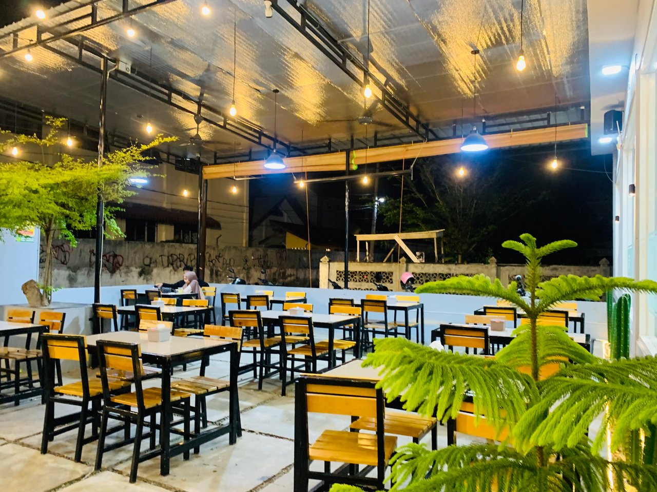 sesampainya ditempat,kami langsung parkir honda dan langsung jalan kearah cafe saat masuk langsung melihat kursi yang disusun rapi,kaca,dan lampu-lampu yang cukup banyak yang digantung diatas atap ,suasana diluar cukup sangat bersih dan cukup luas apalagi ada tanaman pohon yang lumayan besar yang membuat lebih segar.