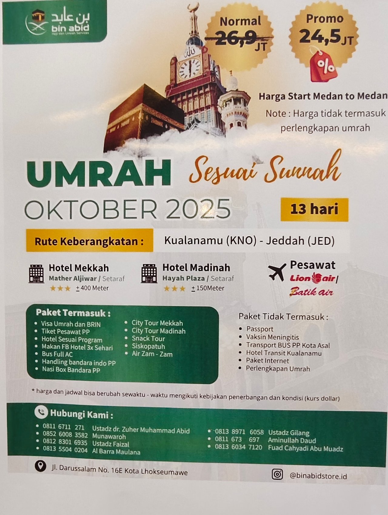 Owner toko ini bukan sekadar pengusaha, beliau seorang dokter di RS PT.PIM dan juga seorang imam di mesjid ALMuntaha yang lahir di Arab Saudi dan menjadi pembimbing jamaah umrah dan mendampingi langsung ke tanah suci. Untuk perjalanan umrah berikut beberapa promo keberangkatan seperti yang saya dapatkan dari Bin Abid Store.