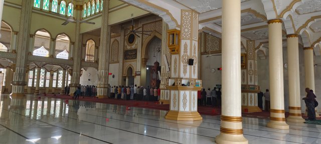 Paduan warna cream dan warna emas didalam mesjid membuat suasana terasa teduh. Suasana diwaktu malam akan terasa beda dengan cahaya lampu putih yang terang ditambah pesona lampu hias.