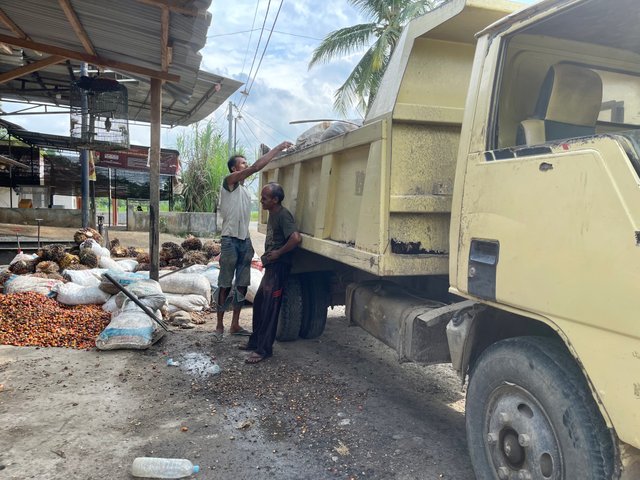 Hari ini saya telah melakukan panen sawit di kebun. Dan untuk menjualnya saya harus membawa tandan sawit ke gudang jual beli tandan sawit ”KLCC” yang letaknya tidak jauh dari kebun sawit saya berada.