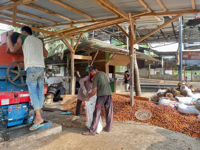 Setelah dirontokkan dengan mesin perontok tadi, kemudian biji-biji sawit ini disortir oleh pekerja disana untuk memisahkan antara biji sawit dan ampas. Gudang usaha jual beli sawit ”KLCC” tidak menerima pembelian sawit yang masih mengkal atau belum waktunya untuk dipanen. Harga pembelian tandan sawit segar pada waktu itu adalah 2550 IDR per kilogram atau setara dengan 1,26 Steem.