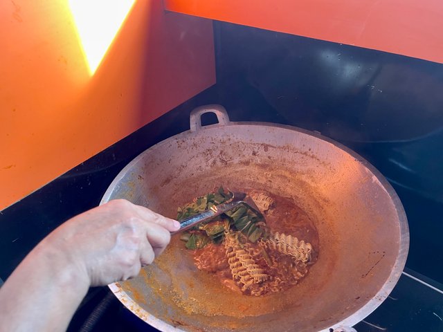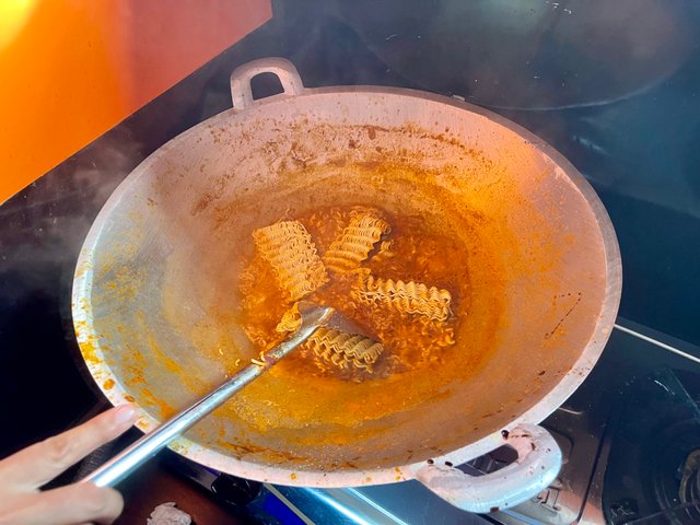 Lalu semua bahan tersebut ditumis dalam wajan yang telah disediakan dengan dicampur bumbu racikan khusus tadi. Kemudian air dituangkan secukupnya dan ditunggu hingga mendidih. Ketika air sudah mendidih, mie instan dimasukkan dan diaduk hingga merata. Aroma wangi akan keluar dari asap adukan mie dari kuali hingga membuat sangat menggugah selera.
