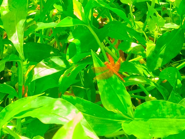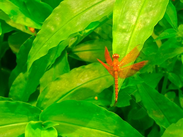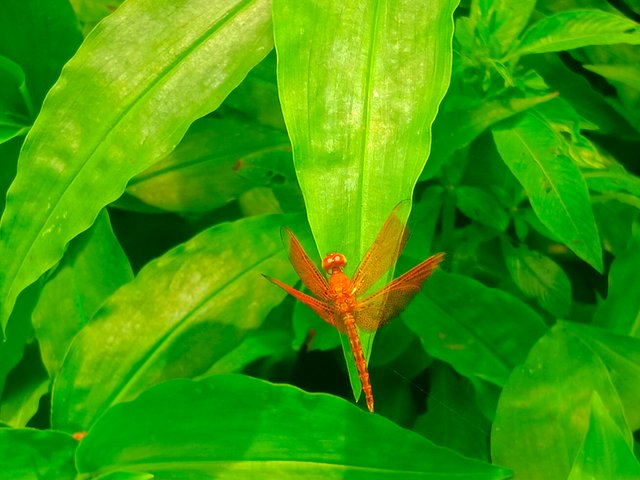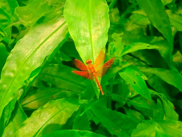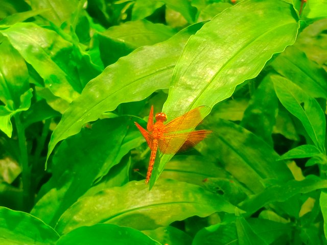 While walking in nature, we often witness scenes that fascinate us. And while wandering around one afternoon, I suddenly caught sight of this extraordinarily beautiful grasshopper. And usually we are used to seeing grasshoppers in blue-green or black colors, but the color of this particular grasshopper was bright reddish orange. Which was really eye-catching, and its beauty seemed to be even darker while sitting on the green leaves. And the grasshopper is actually an insect class called Dragonfly in English and they mainly live near water or in humid environments. And their wings are transparent, thin and like a fine net. And the wings of the grasshopper caught on my mobile phone were orange, sparkling in the sunlight, like colored glass. And in the crowd of green leaves on all sides, this red grasshopper was a symbol of a completely different beauty.
