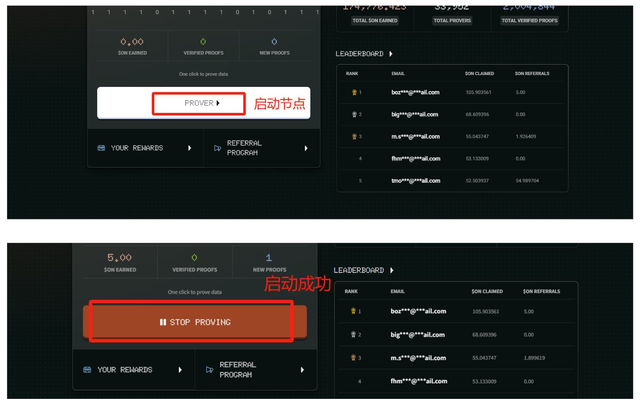 Select “Start Proving.” Initialization might require some time. When “STOP PROVING” displays, the node has commenced successfully.